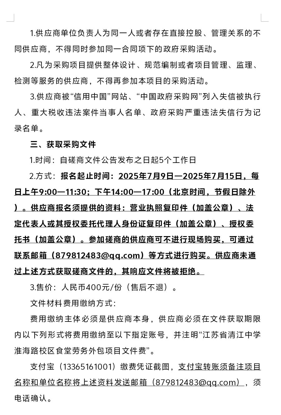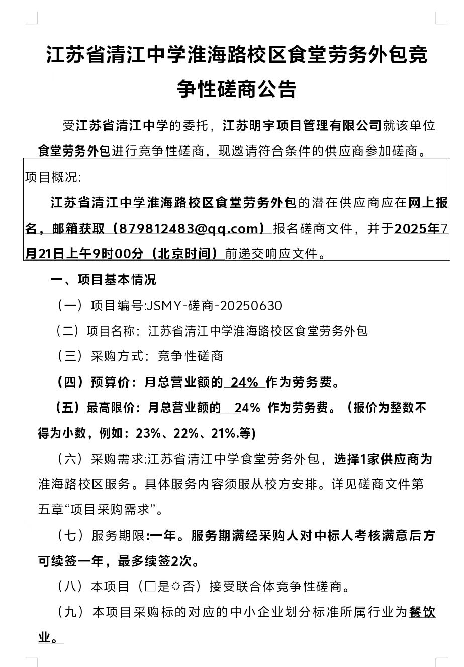 江蘇省清江中學(xué)淮海路校區(qū)食堂勞務(wù)外包競(jìng)爭(zhēng)性磋商公告