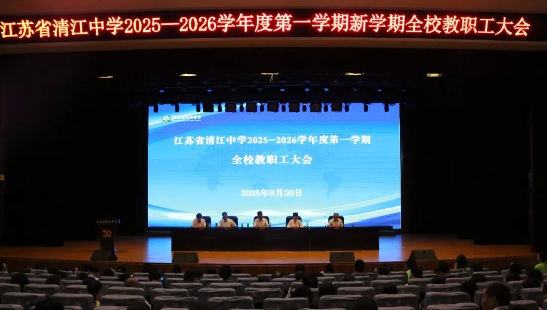 8月30日上午,江蘇省清江中學在千人報告廳隆重舉行2025-2026學年度第一學期第一次全校教職工大會,全面部署新學期工作,動員全校上下咬定目標,團結奮進、篤行實干,全力推進高品質(zhì)高中建設。校黨委書記陳欣,黨委副書記、校長喬中云,副校長王耀松,黨委副書記陸延禮,副校長蔡正鵬出席會議。