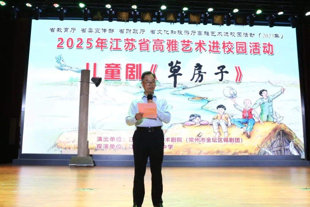 活動伊始,省清江中學(xué)王耀松副校長發(fā)表了熱情洋溢的歡迎辭。他首先代表學(xué)校對遠(yuǎn)道而來的藝術(shù)家們表示最誠摯的感謝,并熱烈歡迎到場觀摩的市實驗小學(xué)、淮師一附小、市外國語實驗小學(xué)、淮安小學(xué)、師院附小的同學(xué)們以及本校初一、初二年級的學(xué)生代表。王校長在致辭中指出,步入青春期的學(xué)子們正深入探尋成長意義,亟需優(yōu)質(zhì)精神食糧的滋養(yǎng)?!恫莘孔印愤@部作品,通過桑桑、杜小康等少年的故事,細(xì)膩描繪了生命的堅韌與溫情,其蘊含的成長思考能引發(fā)廣泛共鳴。他認(rèn)為,此次演出不僅是一場視聽享受,更是一堂生動的美育課、一堂深刻的成長課,希望同學(xué)們珍惜機會,沉心感受,體悟成長,讓藝術(shù)的種子在心田生根發(fā)芽。