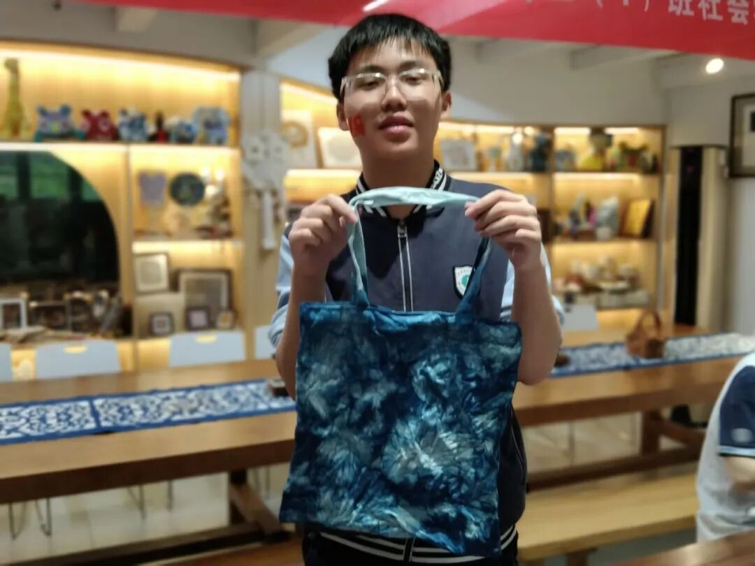 張業(yè)謙同學(xué)說:“今天親手體驗(yàn)了扎染,真的太神奇了!一折一疊,皮筋一扎,浸入染缸,展開的瞬間,美麗的藍(lán)色花紋像在布上綻放。我完全被古人的智慧震撼了——他們怎么想到用如此簡單的方法創(chuàng)造出這么美的圖案!”