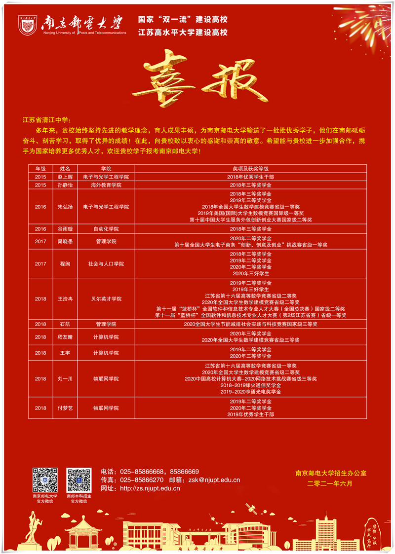 南京郵電大學(xué)向清江中學(xué)發(fā)來(lái)喜報(bào)