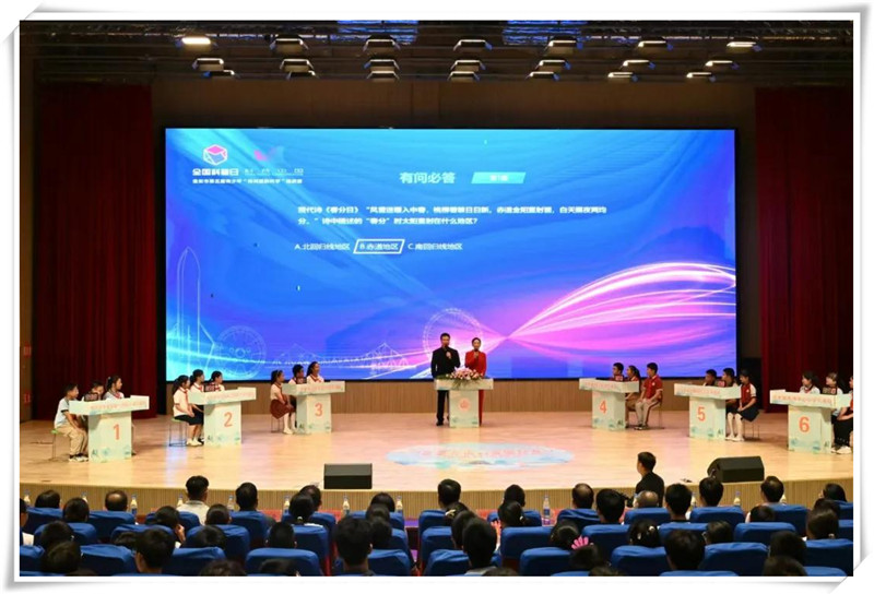 啟動(dòng)儀式現(xiàn)場(chǎng),還舉行了“詩(shī)詞里的科學(xué)”挑戰(zhàn)賽?;搓帋煼秾W(xué)院物理學(xué)教授華正和、淮安市委宣傳部未成年人思想道德建設(shè)處處長(zhǎng)胡薇薇以及江蘇省清江中學(xué)學(xué)工處主任曹久虎擔(dān)任挑戰(zhàn)賽評(píng)委。來(lái)自淮安市六所小學(xué)與六所中學(xué)的代表隊(duì)在“詩(shī)詞里的科學(xué)”挑戰(zhàn)賽中展開(kāi)了激烈的角逐。在有問(wèn)必答、搶答、飛花令三個(gè)環(huán)節(jié)中,選手們以詩(shī)詞為媒,展現(xiàn)了他們對(duì)科學(xué)的熱愛(ài)。