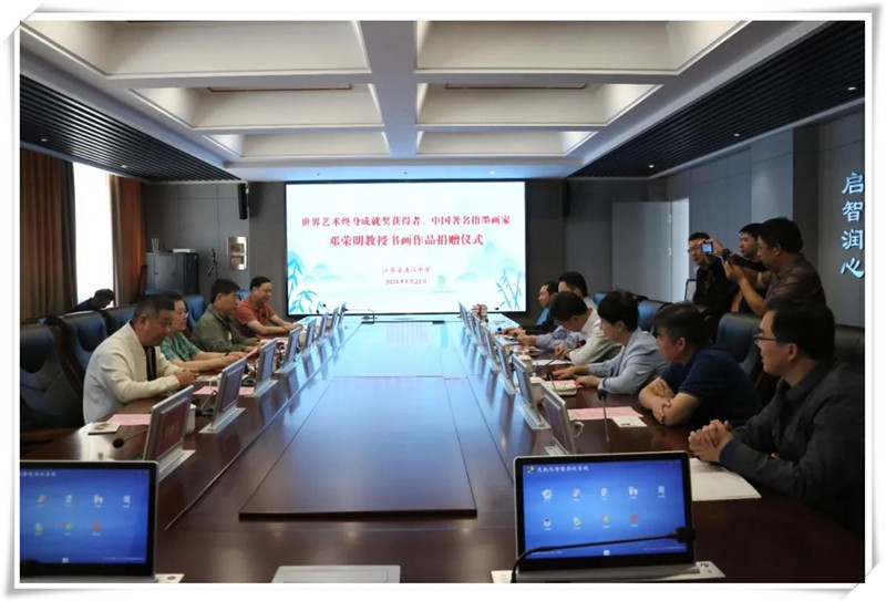 9月23日上午,國(guó)家一級(jí)美術(shù)師、世界藝術(shù)終身成就獎(jiǎng)獲得者、中國(guó)畫(huà)(指畫(huà))非物質(zhì)文化遺產(chǎn)繼承人鄧榮明先生,省清中知名校友朱錦女士,淮安市溫州商會(huì)常務(wù)副會(huì)長(zhǎng)趙烽先生嘉賓一行專(zhuān)程蒞臨省清中,再次向我校捐贈(zèng)鄧榮明先生指墨畫(huà)新作《綠水青山就是金山銀山》。校黨委書(shū)記陳欣,校黨委副書(shū)記、校長(zhǎng)喬中云,紀(jì)委書(shū)記王堅(jiān)及相關(guān)處室負(fù)責(zé)人出席捐贈(zèng)儀式。