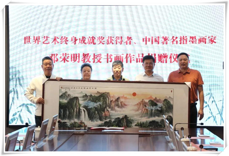 鄧榮明先生、朱錦女士、趙烽先生等向省清中捐贈(zèng)六尺指墨畫(huà)《綠水青山就是金山銀山》。